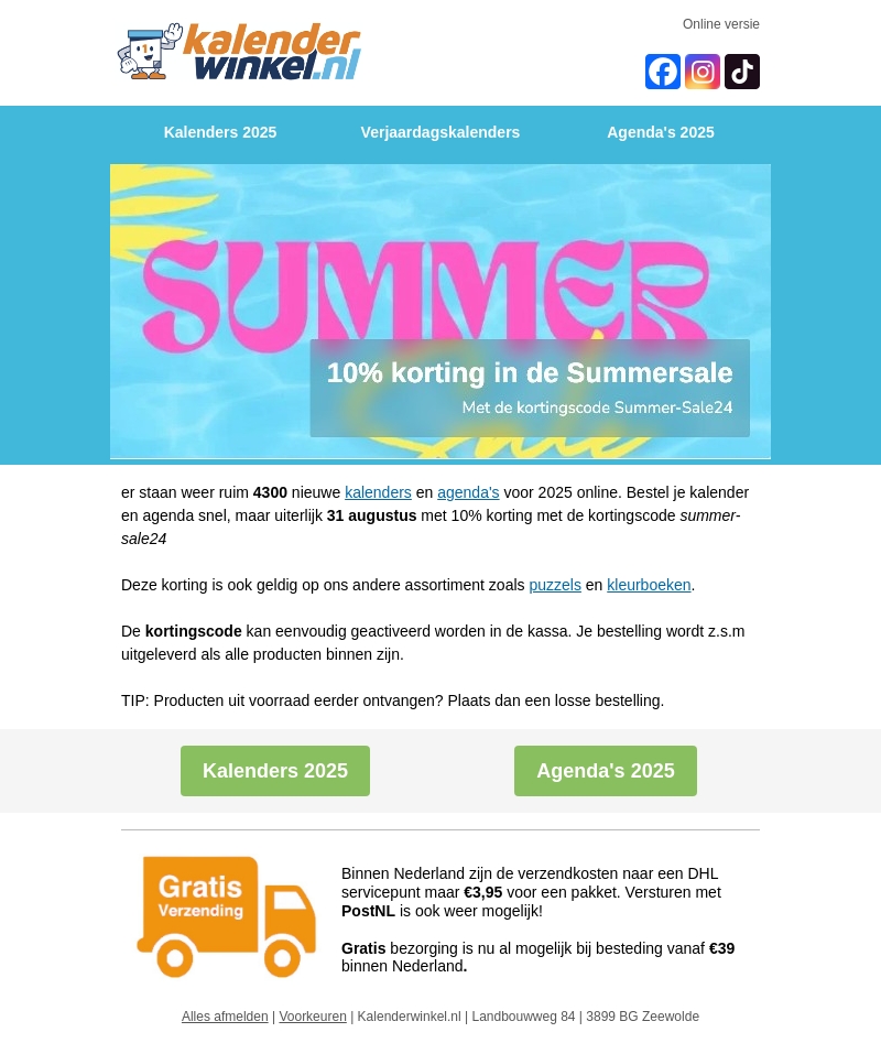 De Summer Sale bij Kalenderwinkel.nl is begonnen met 10% korting op kalenders, agenda's en andere assortimenten zoals puzzels en kleurboeken. Bestel je kalenders en agenda's voor 2025 vΓ³Γ³r 31 augustus en gebruik de kortingscode summer-sale24. Gratis bezorging bij besteding vanaf β¬39 binnen Nederland. Mis deze geweldige aanbiedingen niet!