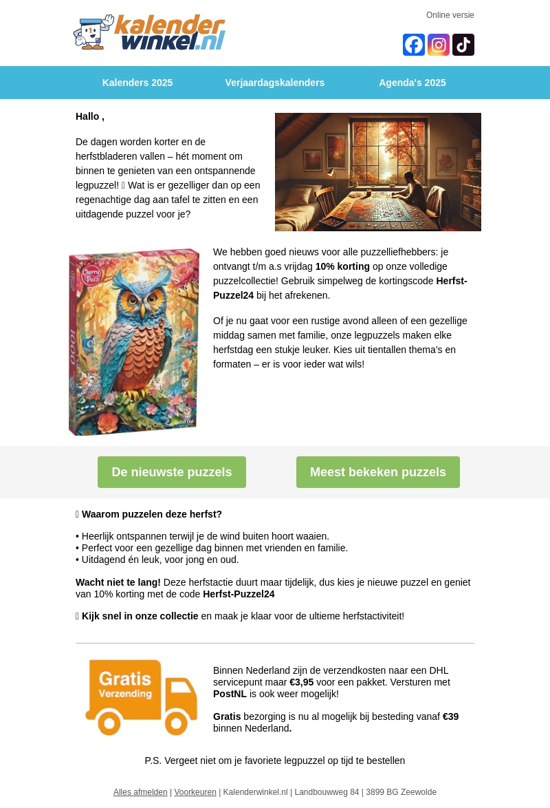 De herfst is de perfecte tijd om binnen te puzzelen. Profiteer nu van 10% korting op onze gehele puzzelcollectie. Gebruik de kortingscode Herfst-Puzzel24 bij het afrekenen. Of je nu ontspant in je eentje of geniet met familie, onze legpuzzels zorgen voor urenlang plezier. Kies uit diverse thema's en maten.