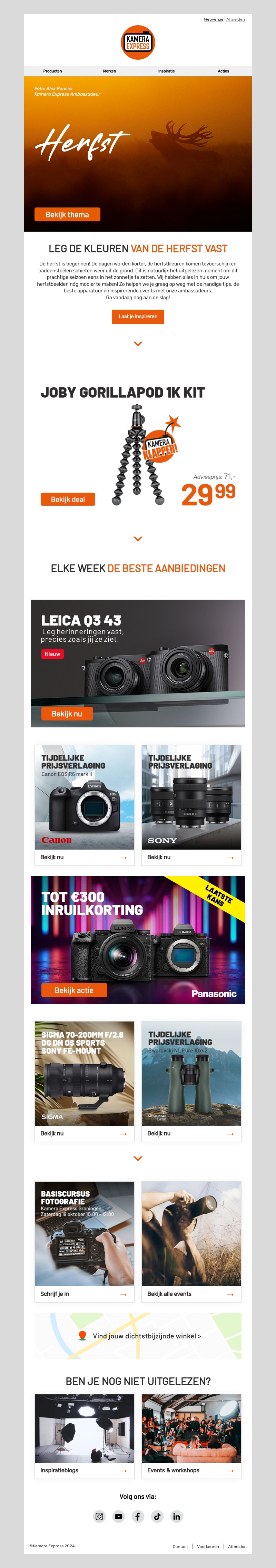 De herfst is begonnen! Dit seizoen is perfect om eropuit te trekken met je camera en de prachtige kleuren van de herfst vast te leggen. Ontdek de beste camera-aanbiedingen, waaronder de JOBY GorillaPod 1K Kit voor slechts 29,99. Bekijk nu de aanbiedingen van merken zoals Canon, Sony en Panasonic. Nieuwsgierig naar cursussen en workshops? Schrijf je in voor onze basiscursus fotografie.