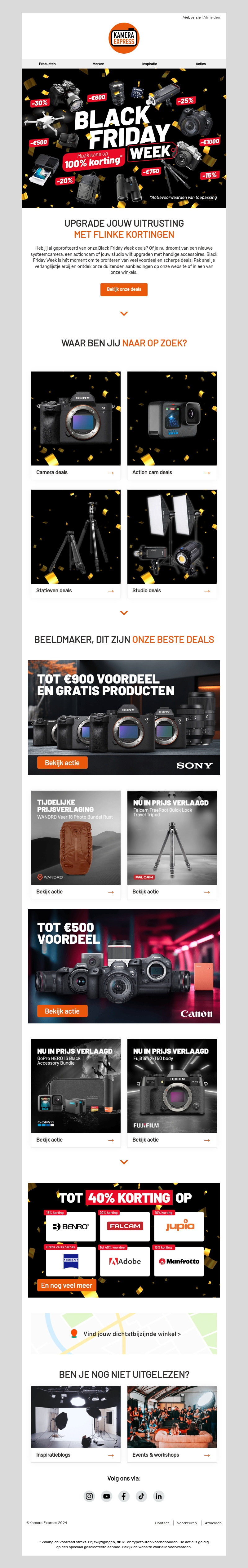 Verwen jezelf met fantastische aanbiedingen op camera's, accessoires en meer tijdens onze Black Friday Week. Profiteer van kortingen tot wel 40% op topmerken zoals Sony, Canon en Fujifilm. Deze week is de perfecte kans om je uitrusting te upgraden met flinke besparingen. Mis het niet en bekijk onze selectie van deals. Of je nu op zoek bent naar een nieuwe camera, drone of statief, wij hebben het allemaal.