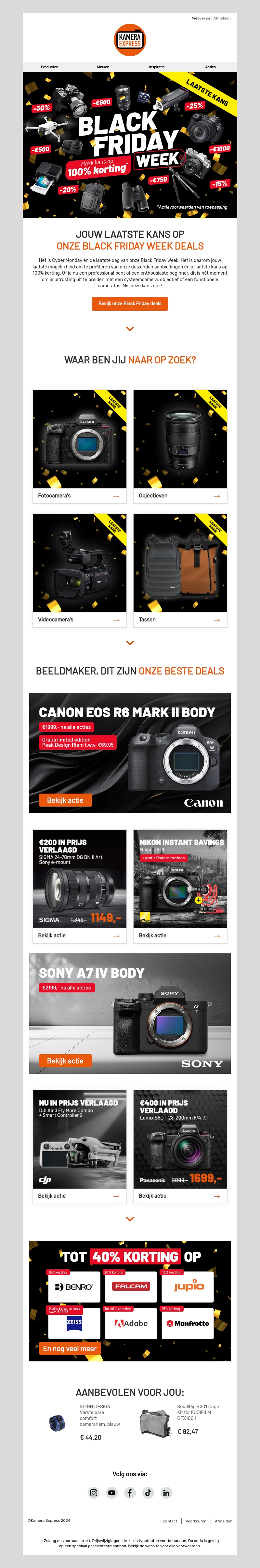 Mis de Cyber Monday deals niet bij Kamera Express! Dit is je laatste kans om te profiteren van spectaculaire kortingen tijdens de Black Friday Week. Of je nu op zoek bent naar camera's, lenzen of accessoires, er zijn aanbiedingen voor iedereen. Pak nu jouw deal voordat de tijd op is.