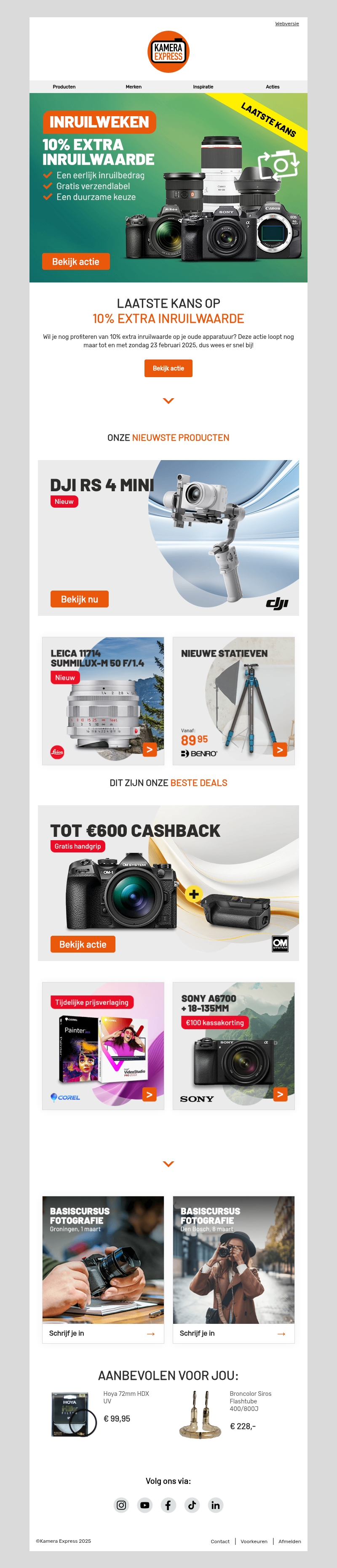 Ontdek de unieke inruilweken bij Kamera Express en ontvang 10% extra inruilwaarde op je oude camera-apparatuur. Deze duurzame keuze komt met gratis verzending. Wacht niet te lang, want deze aanbieding loopt tot zondag 23 februari 2025. Bekijk ook de nieuwste producten en speciale deals, zoals cashback tot €600.