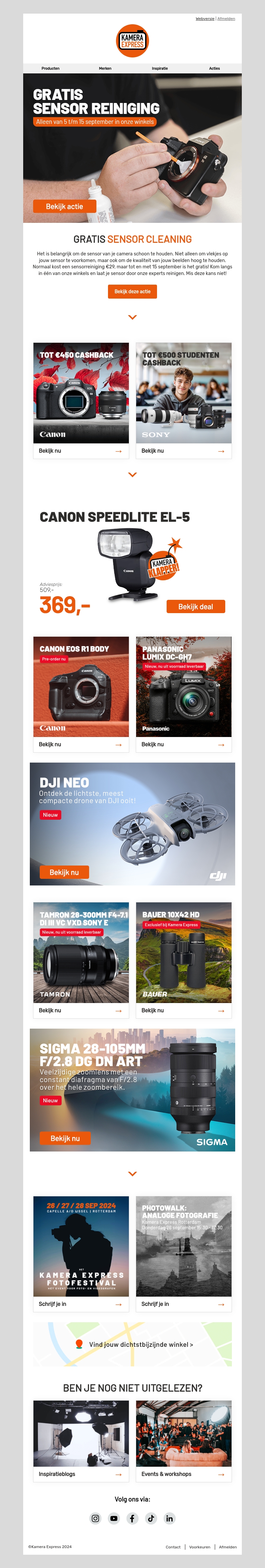 Houd je camera in topconditie met gratis sensorreiniging bij Kamera Express. Deze actie loopt tot 15 september. Profiteer ook van diverse cashback aanbiedingen tot wel €650. Ontdek de nieuwste producten zoals de Canon Speedlite EL-5 en DJI Mini 4 Pro drone. Mis het niet en bekijk nu alle deals!