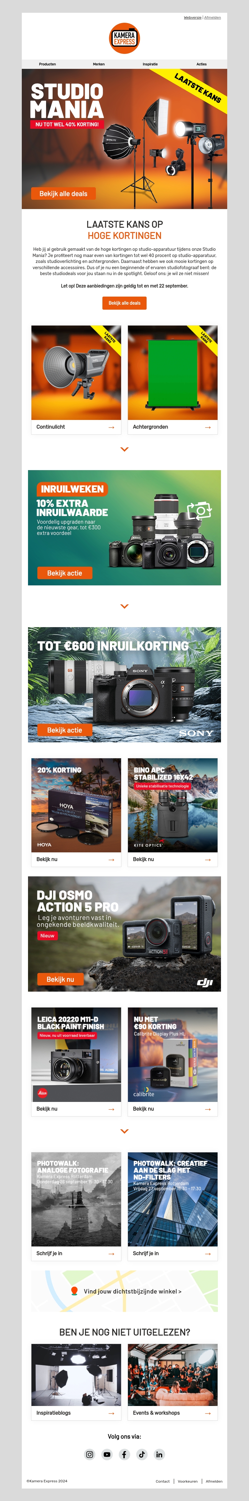 Mis deze laatste kans niet om te profiteren van hoge kortingen tijdens onze Studio Mania. Bespaar tot wel 40% op diverse studio-apparatuur en accessoires. Bekijk alle aanbiedingen en verbeter jouw studio-setup. Daarnaast zijn er inruilweken met 10% extra inruilwaarde en aanbiedingen zoals tot €600 inruilkorting op Sony apparatuur en 20% korting op Hoya filters.