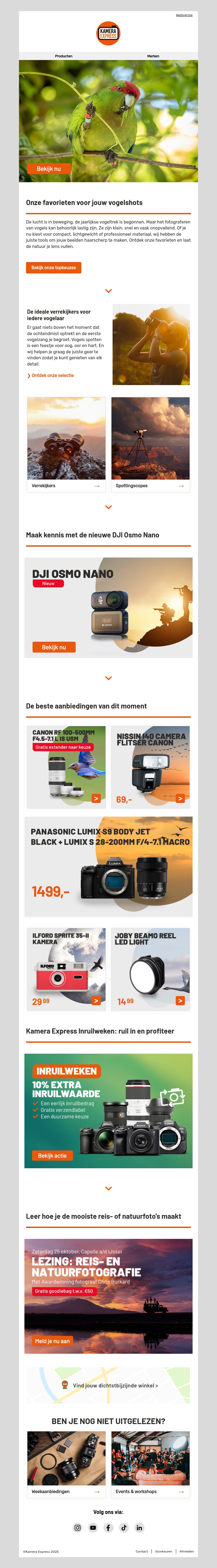 Ontdek camera’s, lenzen en verrekijkers voor vogelfotografie