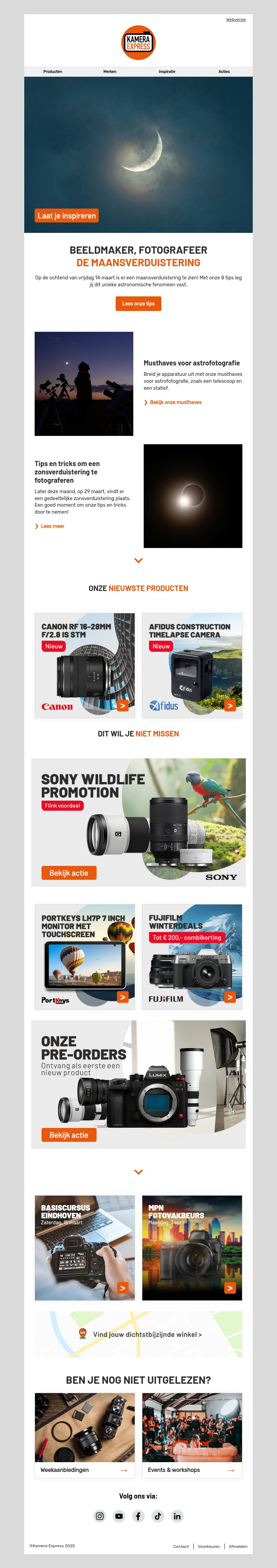 Aanstaande vrijdag is er een unieke maansverduistering te zien. Bereid je voor met de beste tips en producten speciaal voor deze gelegenheid. Ontdek musthaves voor astrofotografie en zorg dat je klaar bent om dit fenomeen vast te leggen. Bekijk ons uitgebreide aanbod aan camera's en lenzen, en profiteer van aantrekkelijke kortingen. Lees onze tips voor het fotograferen van verduisteringen en laat je inspireren door de sterrenhemel.