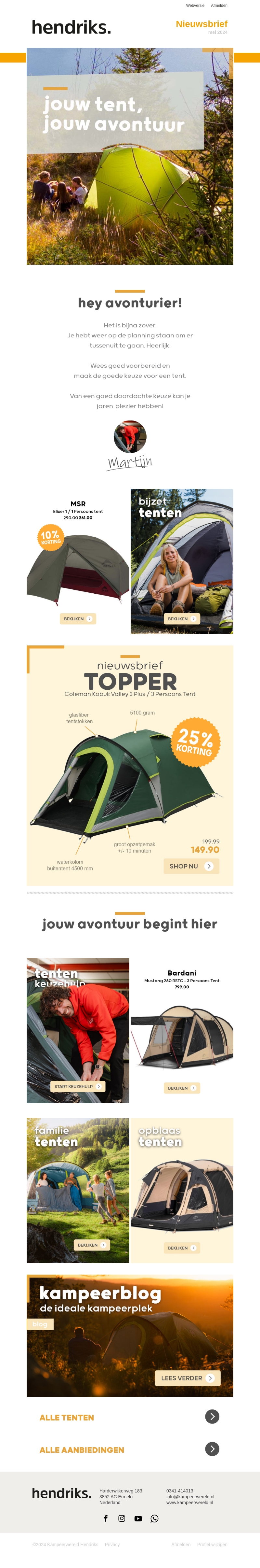 Hey avonturier! Bereid je voor op je volgende avontuur met onze nieuwste selectie van kampeertenten. Profiteer van geweldige kortingen, ontdek onze top keuzes en lees onze kampeerblog voor de beste tips. Van bijzettent tot familietent, wij hebben het allemaal!