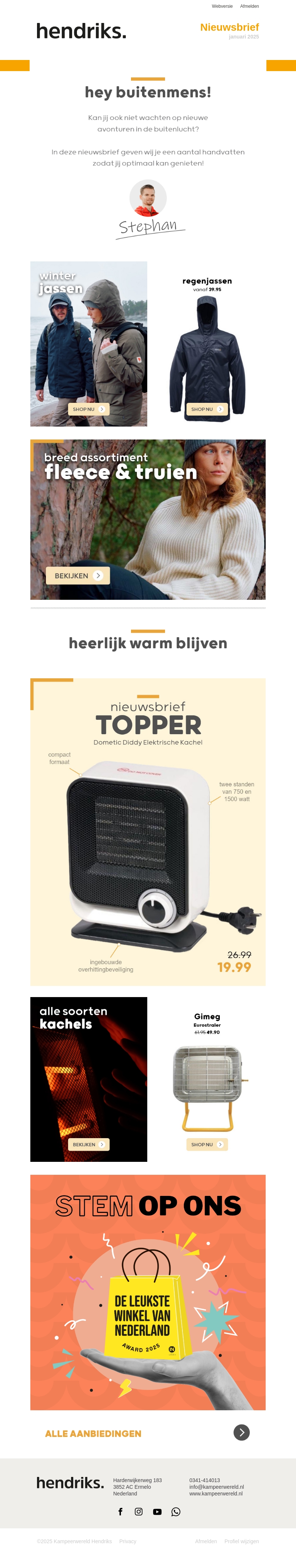 Kan jij niet wachten op nieuwe avonturen in de buitenlucht? In deze nieuwsbrief presenteren wij stevige winterjassen, comfortabele fleecetruien en handige kachels om je warm te houden. Treed stijlvol en goed beschermd de winter tegemoet en ontdek al onze aanbiedingen.