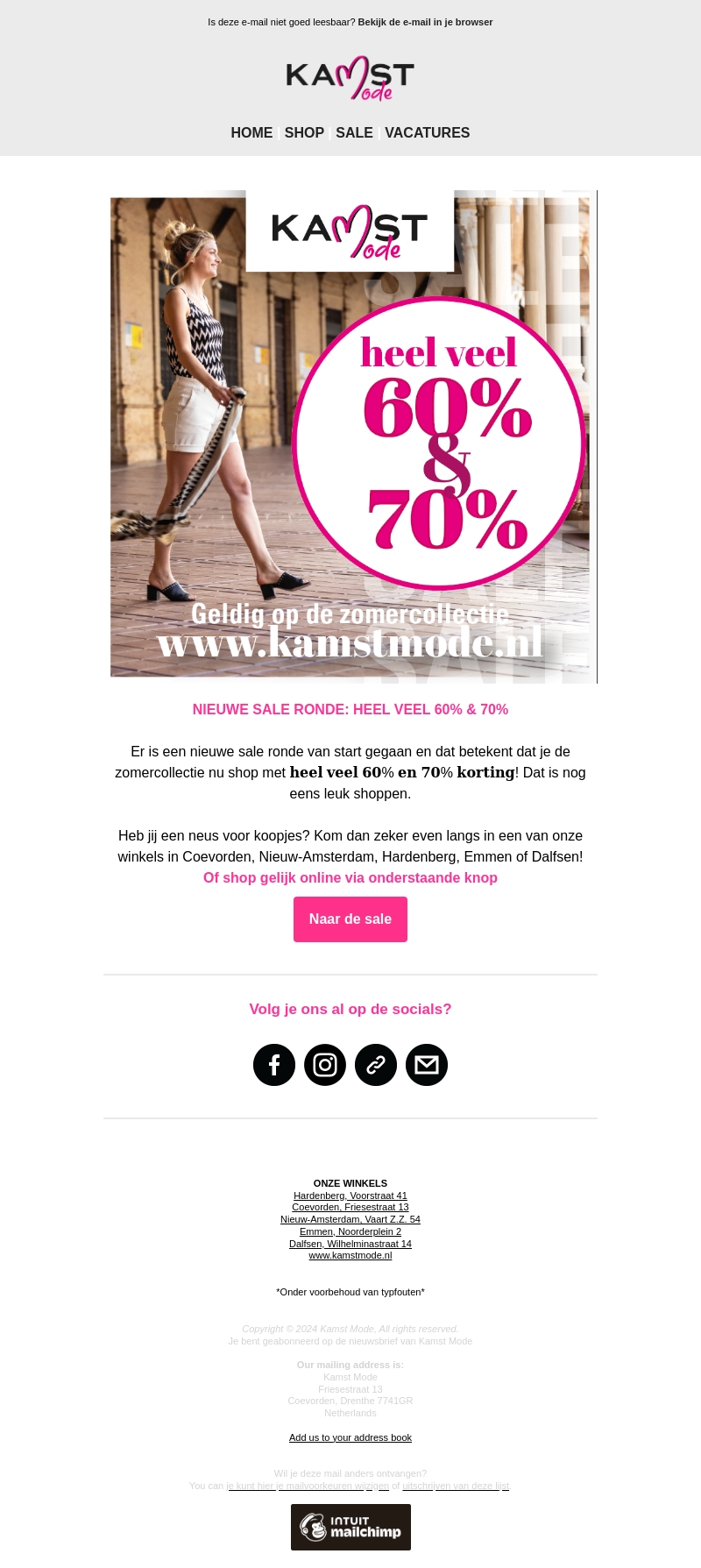 Er is een nieuwe sale ronde van start gegaan bij Kamst Mode! Ontvang nu kortingen van 60% en 70% op de zomermode. Bezoek onze winkels in Coevorden, Nieuw-Amsterdam, Hardenberg, Emmen of Dalfsen, of shop gemakkelijk online.
