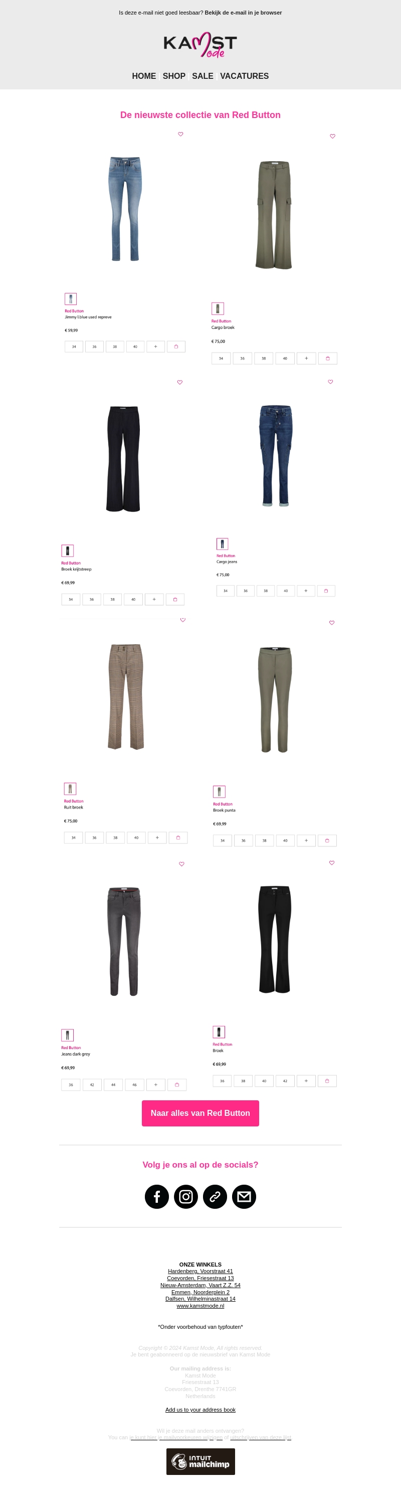 De nieuwste collectie broeken van Red Button is nu verkrijgbaar bij Kamst Mode. Ontdek diverse stijlen, van cargobroeken tot jeans en elegante pantalons. Perfect voor elke gelegenheid.