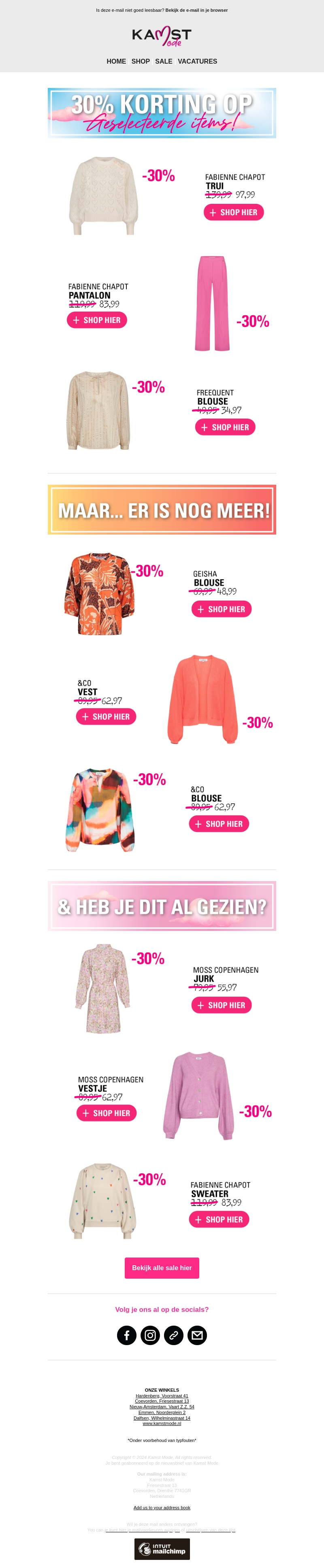 Profiteer nu van 30% korting op geselecteerde items van topmerken zoals Fabienne Chapot, Geisha, &Co en Moss Copenhagen. Mis deze kans niet om modieuze items aan te schaffen tegen gereduceerde prijzen. Bekijk alle details in onze nieuwsbrief en start met shoppen!