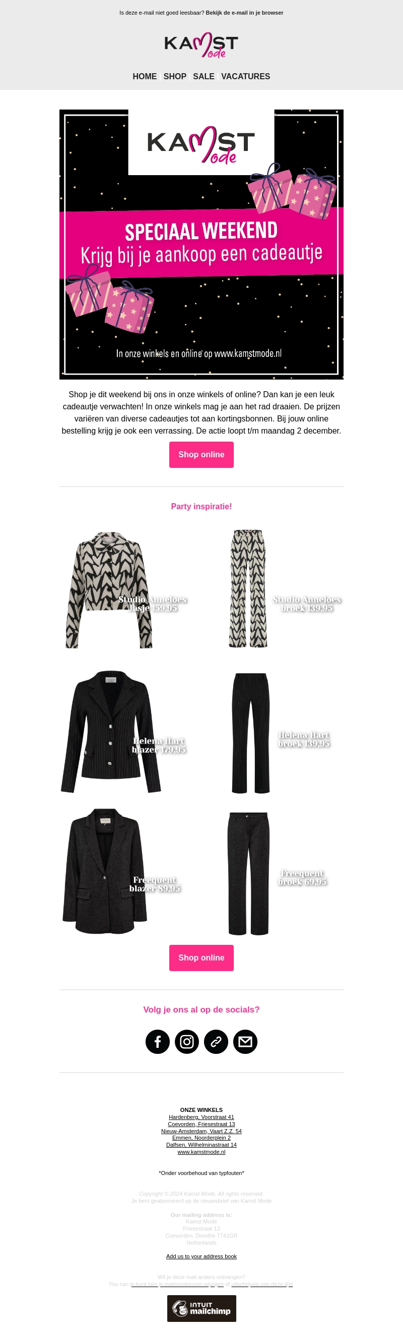 Bezoek Kamst Mode dit weekend en ontvang een bijzonder cadeau bij jouw aankoop. Of je nu online shopt of een bezoek brengt aan één van onze winkels, er staat een verrassing voor je klaar. Profiteer van ons speciale aanbod tot en met maandag 2 december. Mis het niet en shop de leukste mode voor dit seizoen!