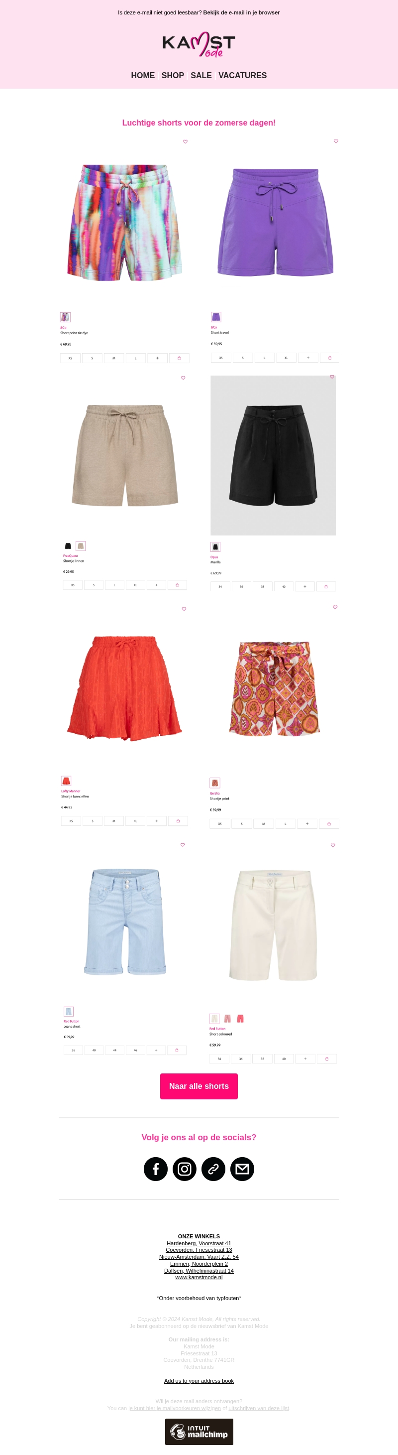 Deze nieuwsbrief biedt een overzicht van de nieuwste collectie zomerse shorts bij Kamst Mode. Ontdek diverse stijlen, kleuren en maten, perfect voor elke zomerdag. Shop vandaag nog en bereid je voor op de warme dagen met stijl!
