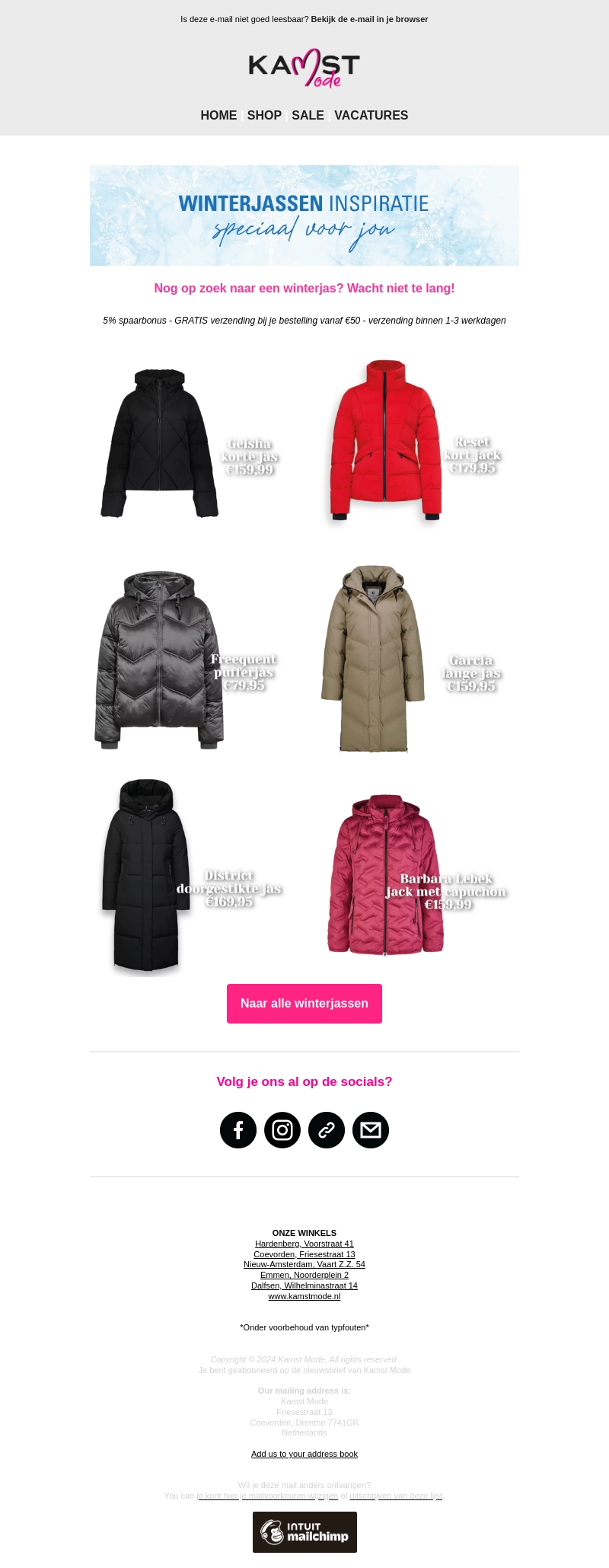 Ben je op zoek naar een stijlvolle en warme winterjas? Kamst Mode biedt een uitgebreide collectie aan tegen aantrekkelijke prijzen. Profiteer van gratis verzending bij bestellingen vanaf €50 en ontvang je bestelling binnen 1-3 werkdagen. Ontdek nu onze favorieten van merken zoals Geisha, Reset en Garcia. Wees er snel bij en bereid je voor op de winter. Bezoek onze website voor meer informatie.