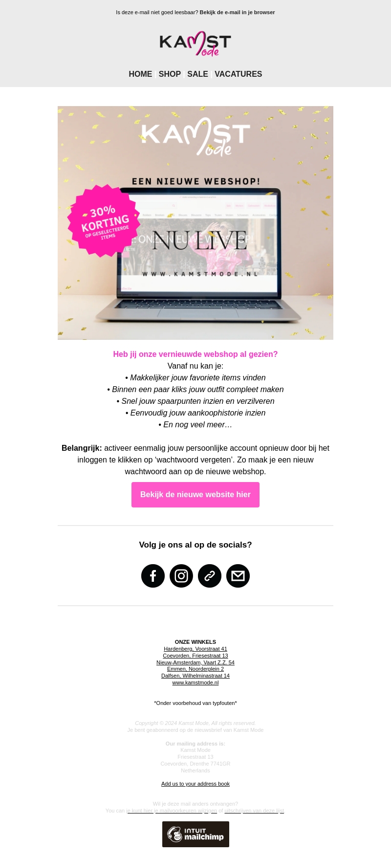 Onze vernieuwde webshop is nu live! Je kunt nu gemakkelijk je favoriete items vinden en je outfit compleet maken binnen een paar klikken. Daarnaast kun je snel je spaarpunten inzien en verzilveren. Bekijk je aankoopgeschiedenis en nog veel meer. Activeer nu je account opnieuw en begin met shoppen!
