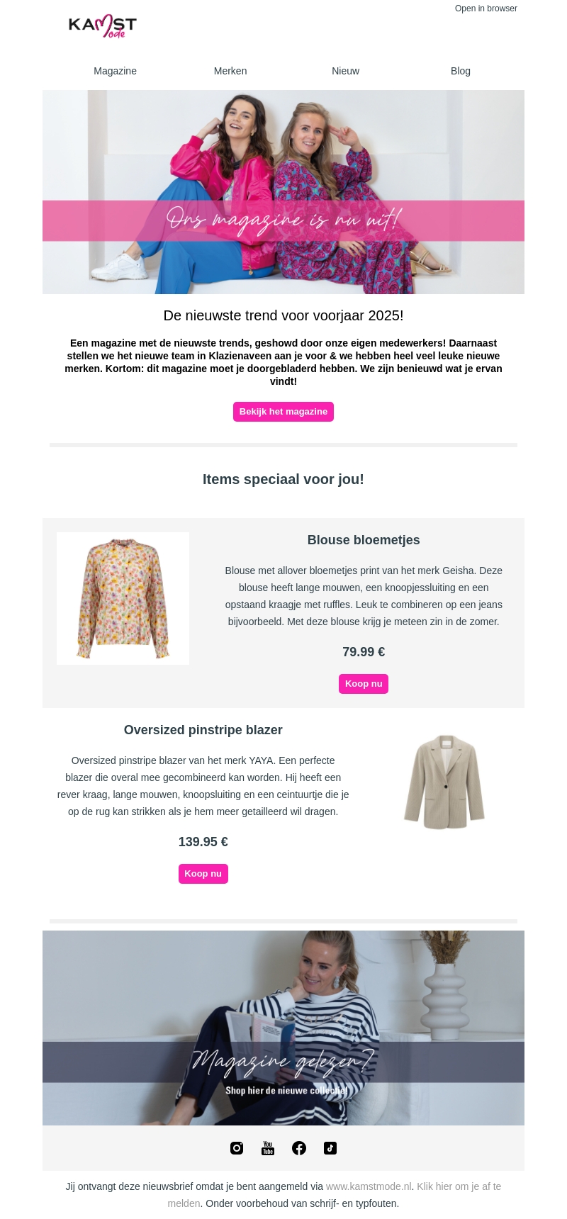 Het nieuwste Kamst Mode magazine staat boordevol de nieuwste trends en items voor voorjaar 2025, inclusief mode van merken als Geisha en YAYA. Onze medewerkers hebben de collecties geshowd, en we introduceren met trots ons nieuwe team in Klazienaveen. Laat je inspireren en ontdek je nieuwe favoriete lente-stijl.