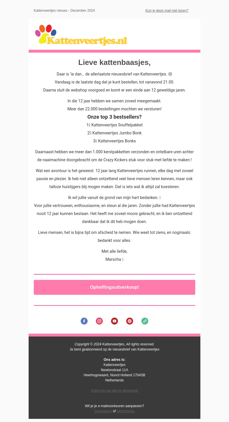 Dit is de allerlaatste nieuwsbrief van Kattenveertjes. Na 12 jaar vol passie en plezier sluit de webshop. Ontdek de top 3 bestsellers en lees een persoonlijk dankwoord van Marscha. Bedank voor de steun en begeleiding door de jaren heen.