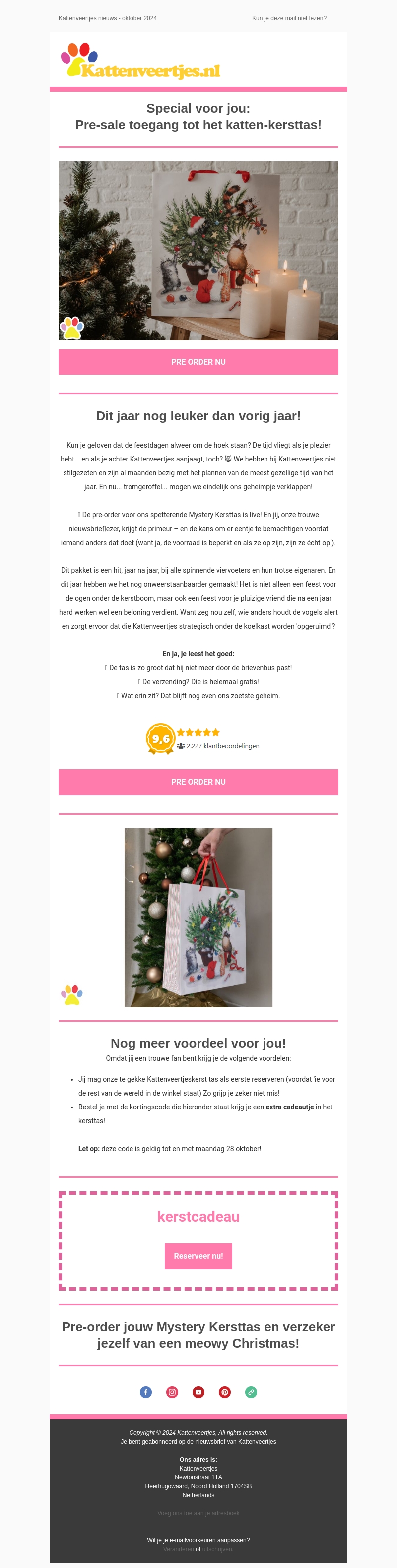 Kattenveertjes nodigt je uit voor een exclusieve pre-sale van hun unieke Mystery Kersttas. Alleen trouwe nieuwsbrieflezers krijgen toegang tot deze kans. De voorraad is beperkt dus wees er snel bij. Ontdek wat er in deze speciale tas zit en geniet van de feestdagen met een glimlach. De tas is groot en verzenden is gratis!