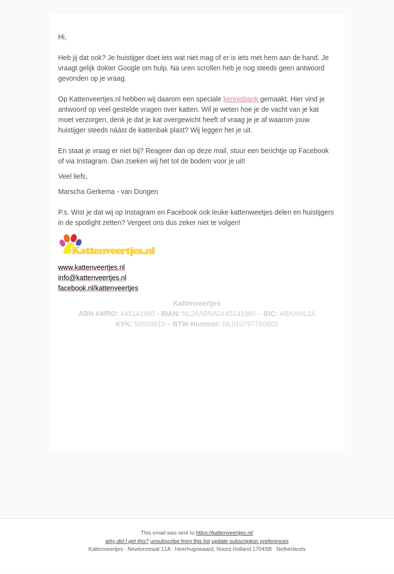 Heb jij ook vragen over je huistijger die je niet kunt beantwoorden? Kattenveertjes.nl helpt je verder met een uitgebreide kennisbank. Hier vind je antwoorden op allerlei vragen over kattenverzorging, gedrag en gezondheid. Lees meer en ontdek hoe wij je kunnen helpen met je geliefde kat.