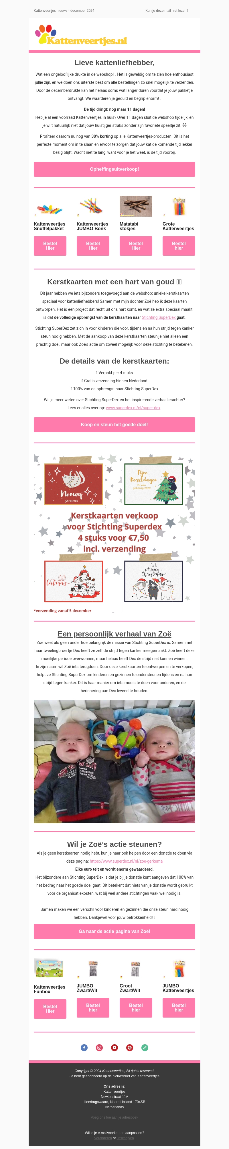 Kattenveertjes.nl viert het einde van een geweldig jaar met fantastische kortingen. Profiteer van 30% korting op geselecteerde artikelen en help Stichting SuperDex met onze unieke kerstkaarten. Elk verkocht kaartje draagt bij aan een goed doel. Bekijk nu onze opheffingsuitverkoop voor magische aanbiedingen!