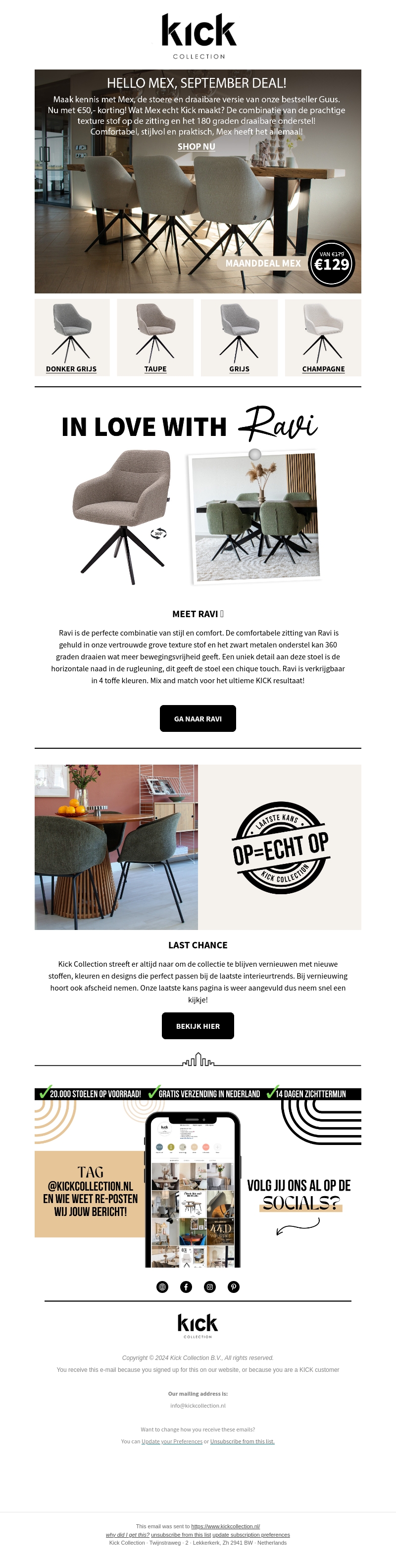 Maak kennis met Mex, de stoere draaibare stoel nu met โฌ50,- korting! Combineer dit met de stijl en comfort van Ravi, verkrijgbaar in vier kleuren. Mis ook onze 'Last Chance' aanbiedingen niet bij Kick Collection!