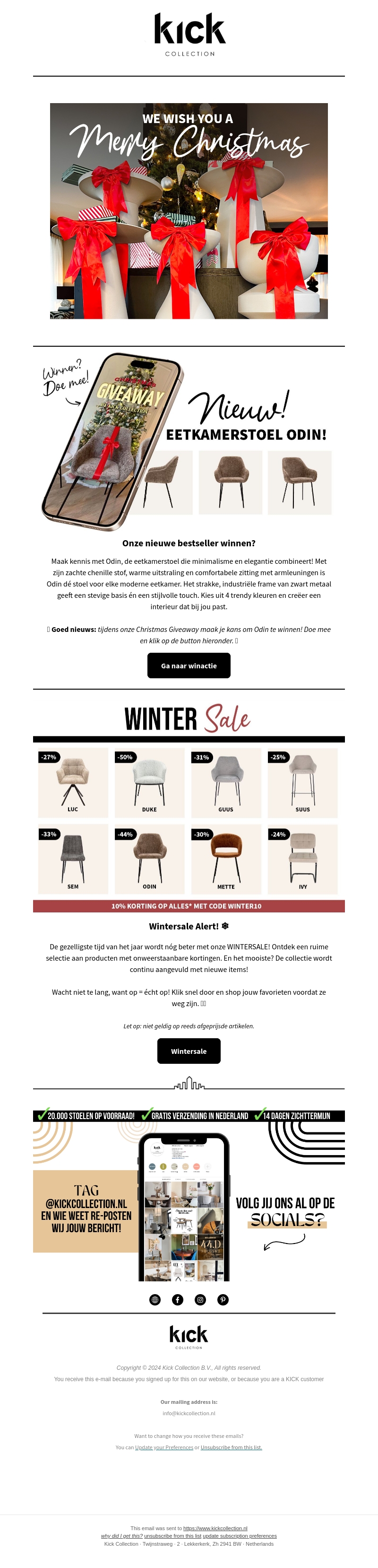 Vier Kerstmis met de nieuwste aanbiedingen van Kick Collection. Geniet van onze exclusieve wintersale met kortingen tot 50% op geselecteerde stoelen. Maak kans op onze bestseller eetkamerstoel Odin in de Christmas Giveaway. Vergeet niet de code WINTER10 te gebruiken voor extra korting. De feestdagen zijn het perfecte moment om je interieur een nieuwe look te geven, wacht niet te lang!