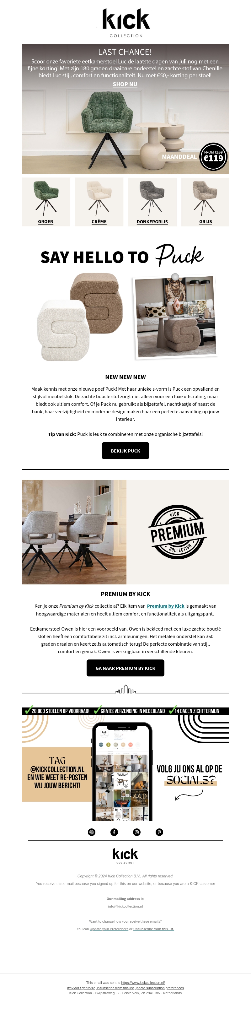 Pak nu je kans en scoor de laatste eetkamerstoelen Luc met een korting van β¬50! Ontdek ook onze nieuwe Puck poef, gemaakt met zachte bouclΓ© voor ultiem comfort. Ontdek de Premium by Kick collectie voor hoogwaardige, stijlvolle meubelen. Mis het niet!