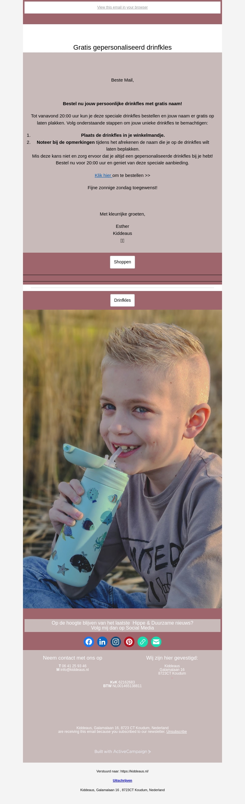 Tot vanavond 20:00 uur kun je jouw persoonlijke drinkfles bestellen met jouw naam erop, geheel gratis! Volg de eenvoudige stappen om je unieke drinkfles te bemachtigen. Plaats de drinkfles in je winkelmandje en noteer je naam bij de opmerkingen tijdens het afrekenen. Klik en bestel nu en geniet altijd van een gepersonaliseerde drinkfles!