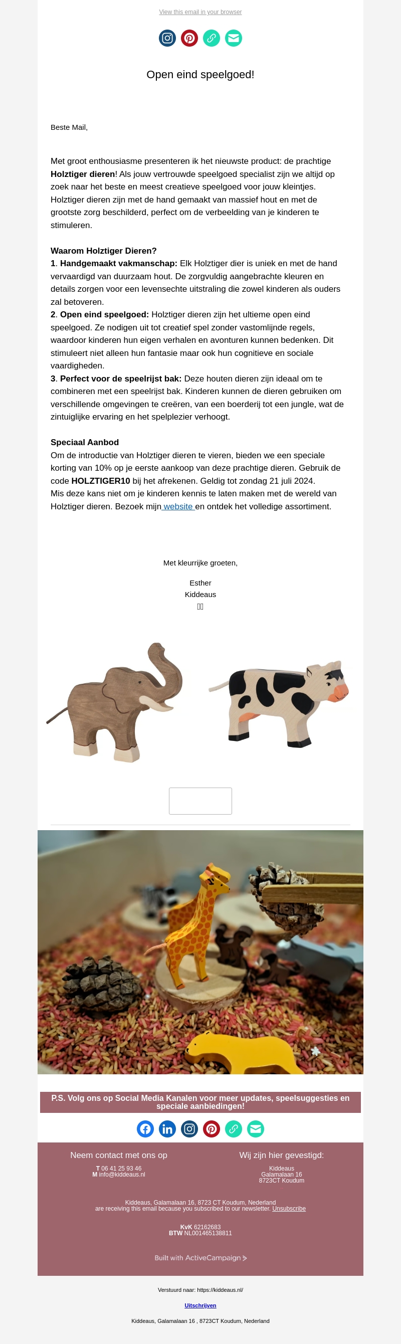Met groot enthousiasme presenteren wij de nieuwste Holztiger dieren! Elk handgemaakt dier is uniek en stimuleert kinderen om hun eigen verhalen en avonturen te bedenken. Haal nu een speciale korting van 10% op uw eerste aankoop met de code HOLZTIGER10.