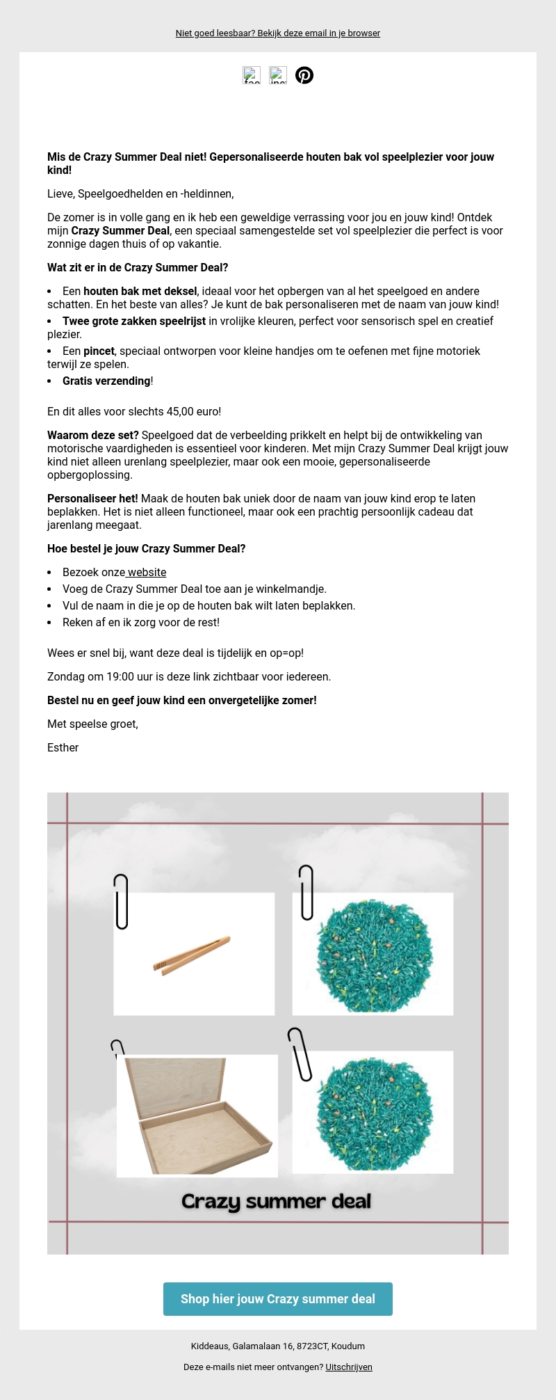 De Crazy Summer Deal biedt een gepersonaliseerde houten bak vol met speelplezier. Het pakket bevat een houten bak met deksel, gekleurde speelrijst, een pincet speciaal ontworpen voor kinderen, en gratis verzending. Alles voor slechts 45,00 euro! Bestel nu en geef jouw kind een onvergetelijke zomer.
