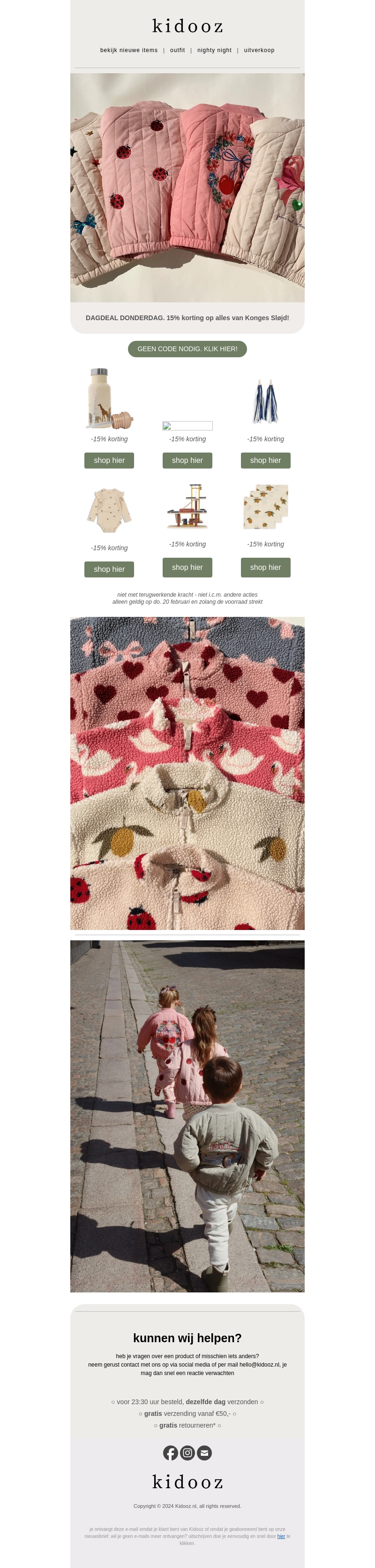 Ontdek de exclusieve donderdag dagdeal van Kidooz met 15% korting op alle producten van het populaire merk Konges Sløjd. Geen code nodig, klik gewoon op de links om te shoppen. Actie geldig tot 20:00 uur zolang de voorraad strekt. Gratis verzending vanaf €50 en gratis retourneren. Shop nu en verwen je kleintjes met stijlvolle en comfortabele kindermode.