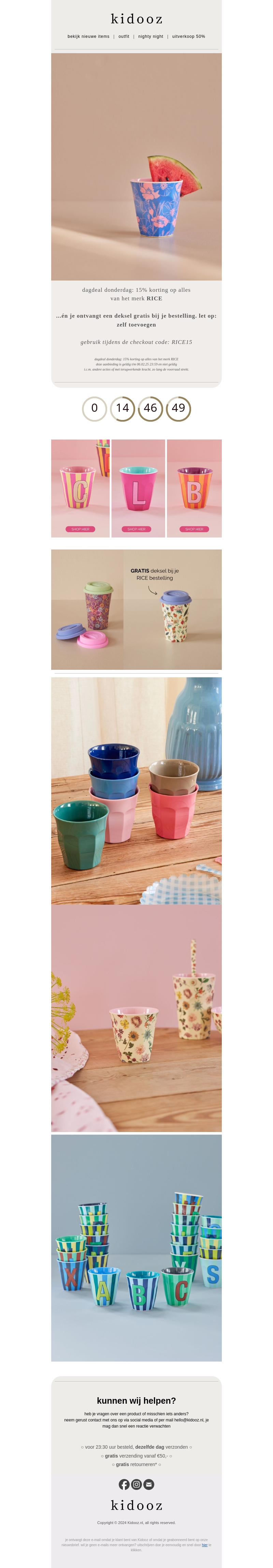 Duik in de wereld van RICE bekers bij Kidooz met een exclusieve 15% korting. Een breed scala aan kleurrijke en unieke designs wacht op jou. Ontvang bovendien een gratis deksel bij je bestelling. Mis deze geweldige deal niet en verfraai je keuken met deze prachtige bekers. Vergeet niet je korting toe te passen met de aangegeven code.