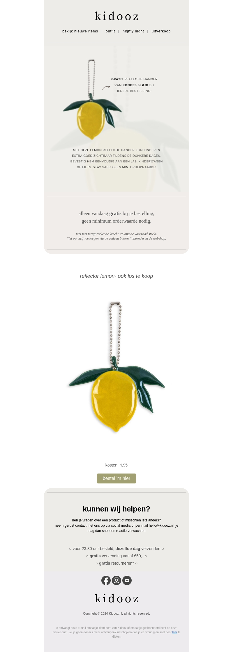 Profiteer van een unieke aanbieding bij Kidooz. Ontvang een gratis Konges Sløjd reflectie hanger bij elke bestelling, zonder minimum bestelwaarde. Dit leuke accessoire zorgt ervoor dat kinderen goed zichtbaar zijn in het donker. Bestel vandaag nog en maak je kinderen extra veilig!