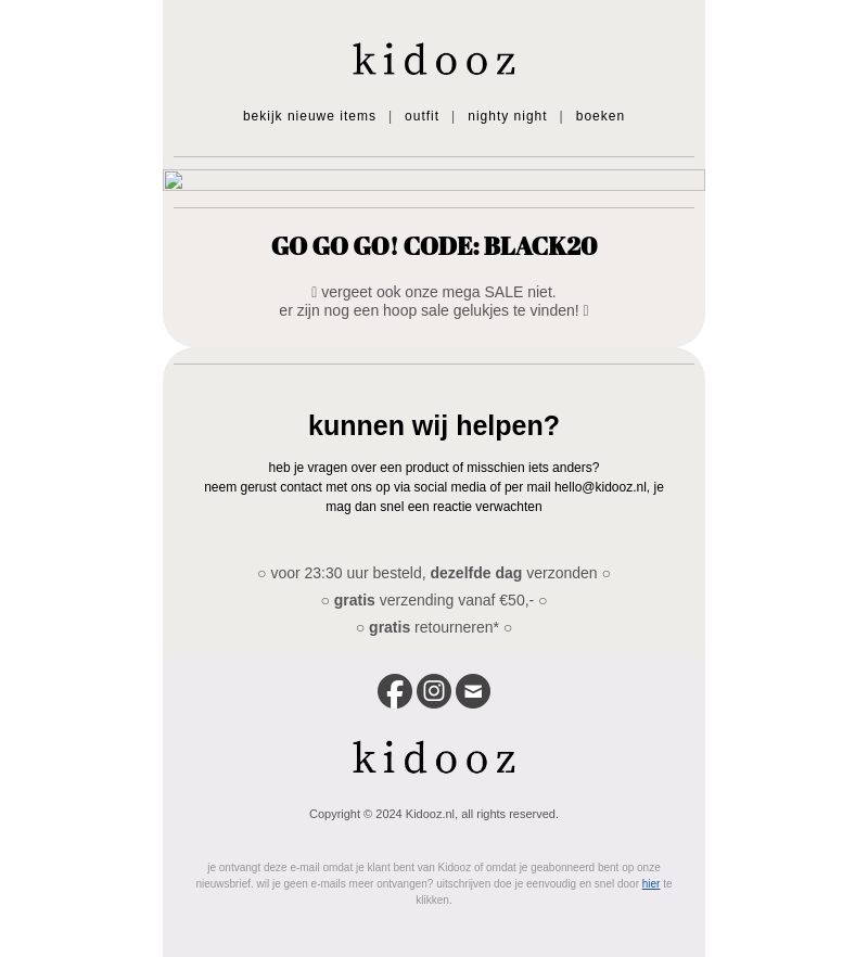 Het is de laatste kans om 20% korting te krijgen op alles bij Kidooz. Gebruik de code BLACK20 bij uw aankoop. Vergeet ook onze Mega Sale niet, want er zijn nog veel gelukjes te vinden. Bestel voor 23:30 uur om dezelfde dag nog te verzenden. Geniet van gratis verzending vanaf €50 en gratis retourneren.
