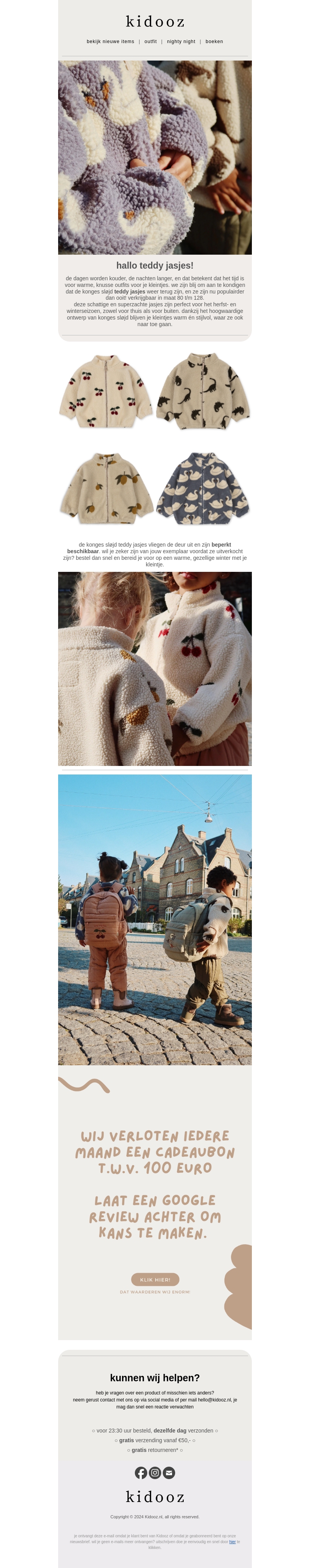De koude dagen zijn aangebroken en de nieuwe teddy jasjes van Konges Sløjd zijn nu verkrijgbaar. Met unieke designs zoals zwanen en kersen, bieden ze niet alleen warmte maar ook stijl aan je kleintje. Beschikbaar in beperkte voorraad, dus wees er snel bij! Maak kans op een cadeaukaart van €100 door een Google review achter te laten.