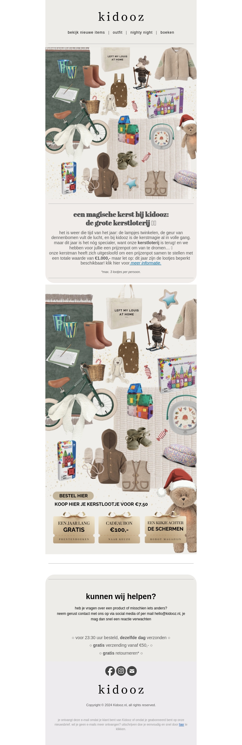 Beleef een magische kerst met Kidooz en hun grote kerstloterij! Voor slechts €7,50 per lotje maak je kans op prachtige prijzen met een totale waarde van €1.000. Denk aan een jaar lang gratis prentenboeken, cadeaubonnen, en een kijkje achter de schermen. Haal snel je lootjes, want op=op! Laat je betoveren door de warme kerstmagie van Kidooz.