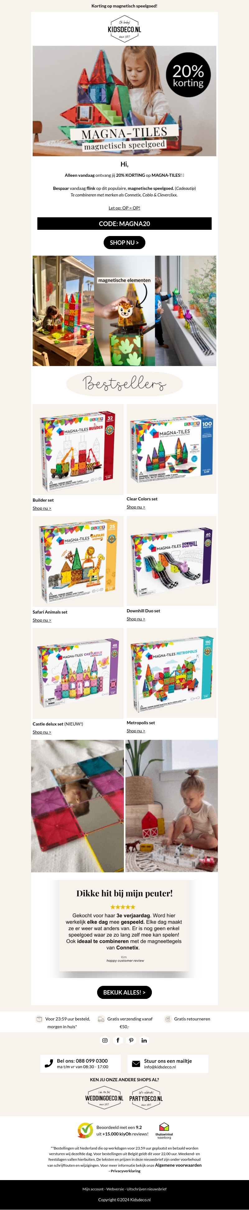 Ontdek nu de exclusieve aanbieding van Kidsdeco.nl met 20% korting op MAGNA-TILES! Deze magnetische speelsets zijn perfect voor creatief spelen en stimuleren de verbeelding van uw kinderen. Sla nu uw slag en verras ze met de spannende Bestsellers zoals de Builder set en Metropolis set. Wees er snel bij, want deze actie geldt maar tijdelijk. Vergeet niet de kortingscode te gebruiken voor extra voordeel.
