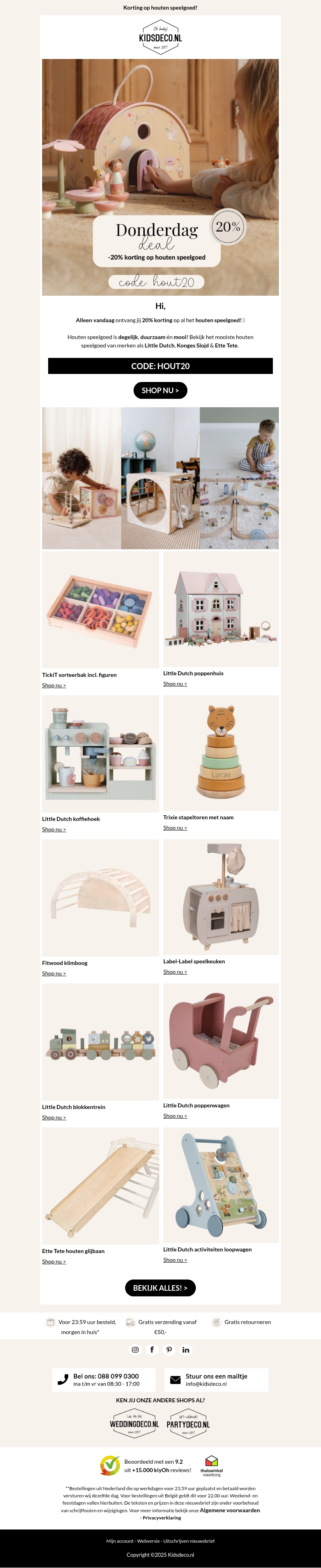 Ontdek de geweldige aanbieding van vandaag bij KidsDeco.nl. Alleen vandaag krijgt u 20% korting op schitterend houten speelgoed van topmerken zoals Little Dutch en Tender Leaf Toys. Deze exclusieve deal is perfect voor het verrijken van de speelruimte van uw kinderen. Haast u om deze kans niet te missen!