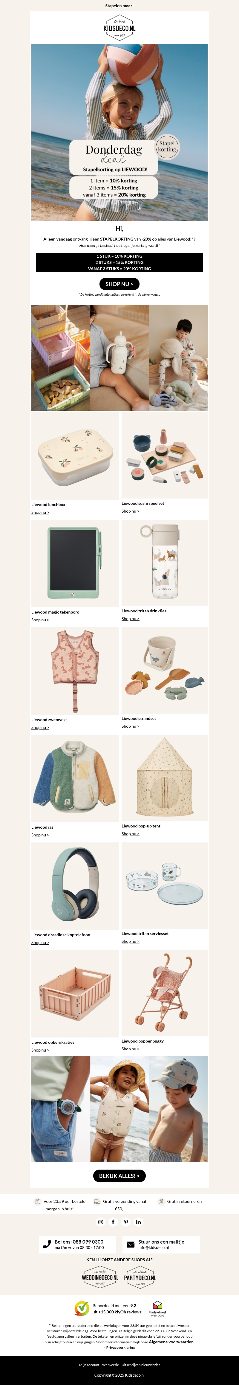 Slechts vandaag kunt u genieten van een exclusieve 20% stapelkorting op Liewood producten bij Kidsdeco. Voeg meer items toe aan uw winkelmand om van hogere kortingen te profiteren. Een must voor iedereen die van kwalitatieve kinderproducten houdt. Ontdek de nieuwste collectie nu en bespaar flink!