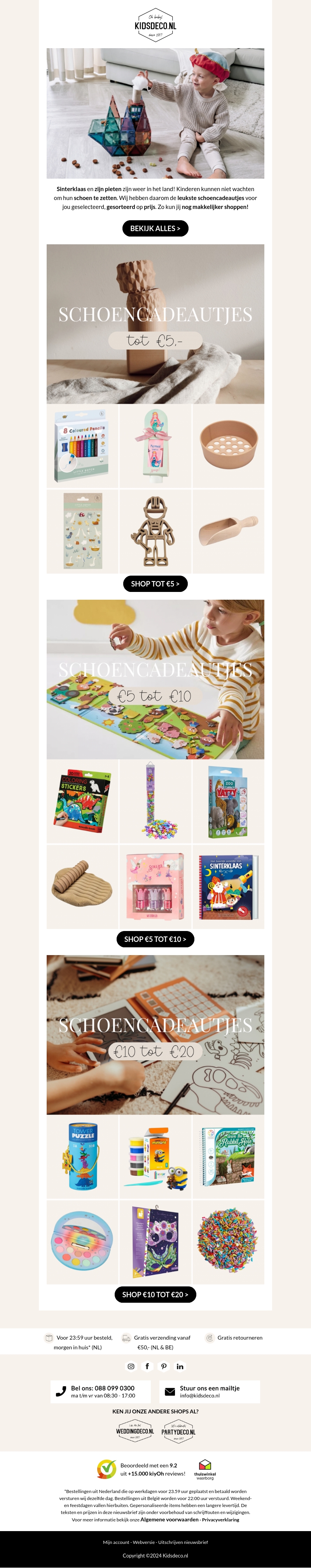 Ontdek een fantastische selectie van schoencadeautjes voor kinderen bij KidsDeco.nl! Van creatieve knutselsets tot leuke speelgoed en meer, er zijn cadeautjes voor elke leeftijd en budget. Maak de Sinterklaasviering extra speciaal met onze zorgvuldig geselecteerde items. Bekijk onze aanbiedingen voor cadeaus van โฌ5 tot โฌ20. Winkel eenvoudig en laat je verrassen door ons uitgebreide assortiment.