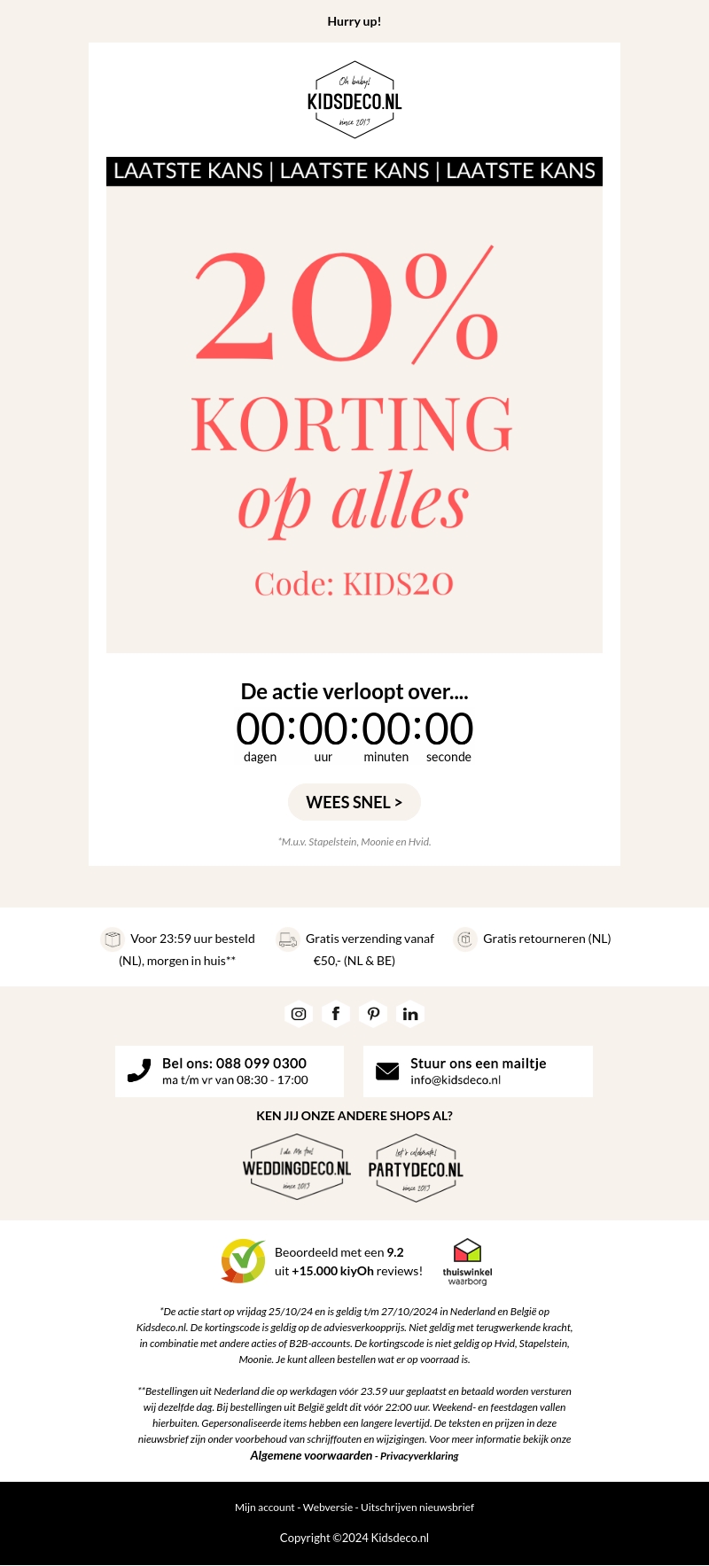 Laat deze kans niet liggen! Kidsdeco.nl biedt je vandaag 20% korting op alles met de kortingscode KIDS20. Deze exclusieve aanbieding verloopt vanavond, dus wees er snel bij! Bestel voor 23:59 uur en profiteer van gratis verzending vanaf €50 in Nederland en België.