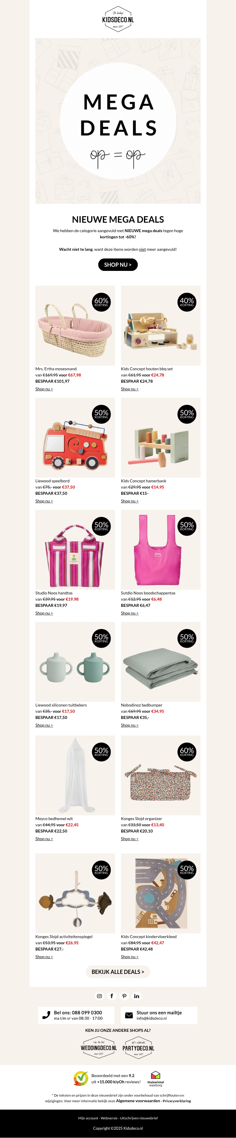 Bij Kidsdeco.nl vind je nu de nieuwste mega deals met kortingen tot wel 60%. Van wasmanden tot houten speelgoedsets, er is voor ieder wat wils. Mis deze kans niet om grote besparingen te realiseren op kwaliteitsproducten. Wacht niet te lang, want op = op. Bekijk snel de deals en shop nu!