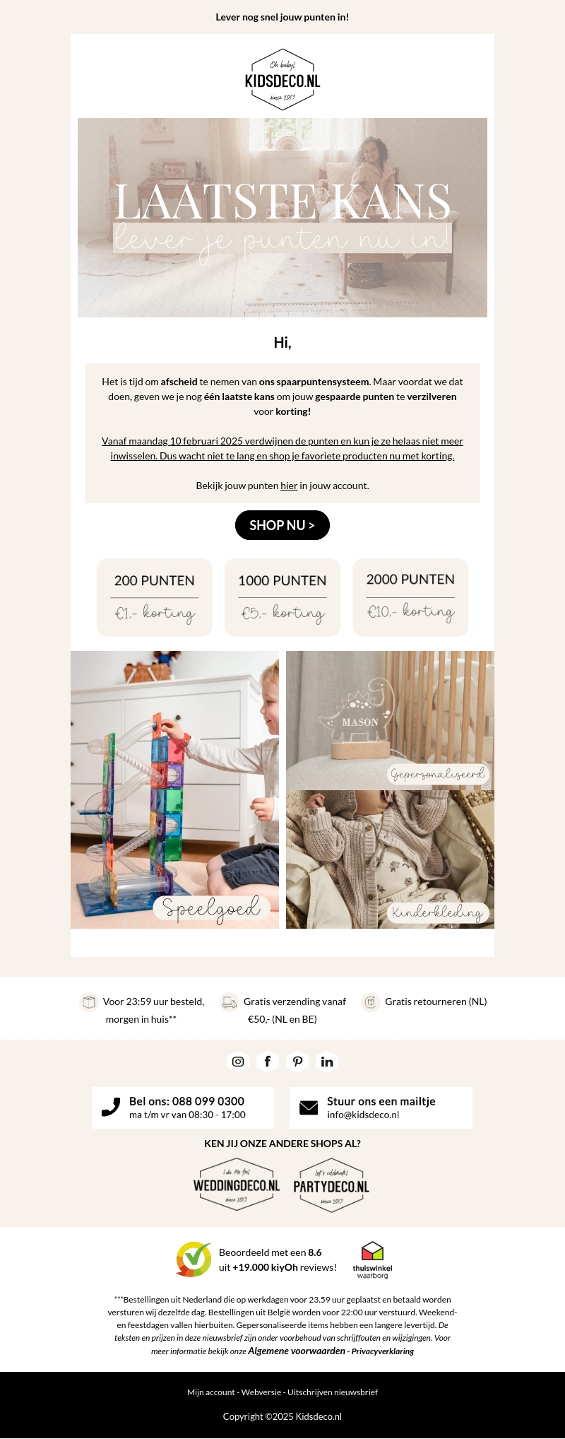 Bij Kidsdeco staat je een laatste kans te wachten om gespaarde punten in te wisselen voor kortingen. Vanaf 10 februari 2025 verdwijnen deze punten en kunnen ze niet meer gebruikt worden. Mis deze unieke kans niet om korting te krijgen op je favoriete producten. Bezoek snel je account en shop je verlanglijstje voordelig. Ontvang interessante kortingen met je bestaande punten.