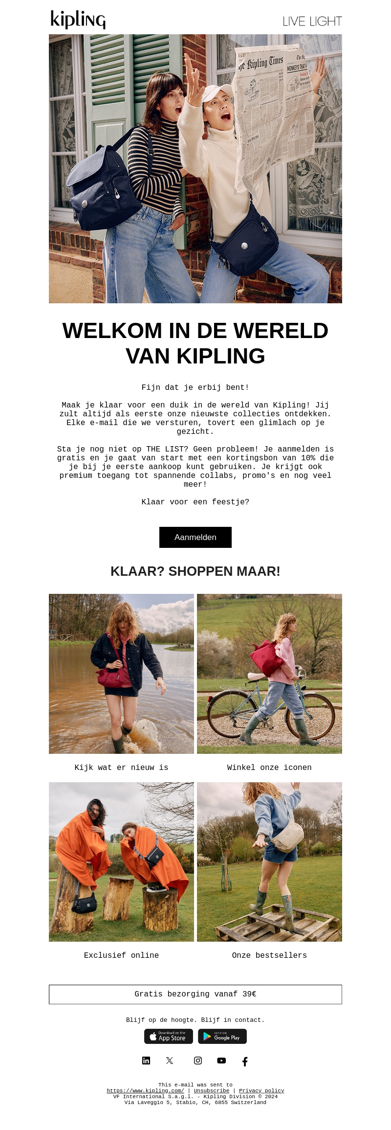 Welkom bij Kipling! Ontdek als eerste onze nieuwste collecties en geniet van exclusieve voordelen. Meld je aan voor THE LIST en ontvang 10% korting op je eerste aankoop. Klaar om te shoppen?