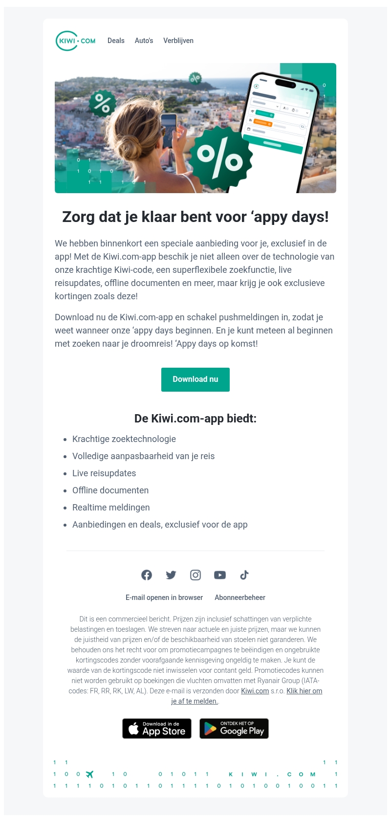 Vrolijke Kiwi-maandag! We bieden je vandaag een korting aan, exclusief voor de Kiwi.com-app