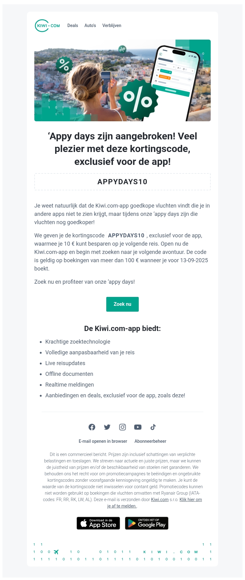Vrolijke Kiwi-maandag! We bieden je vandaag een korting aan, exclusief voor de Kiwi.com-app