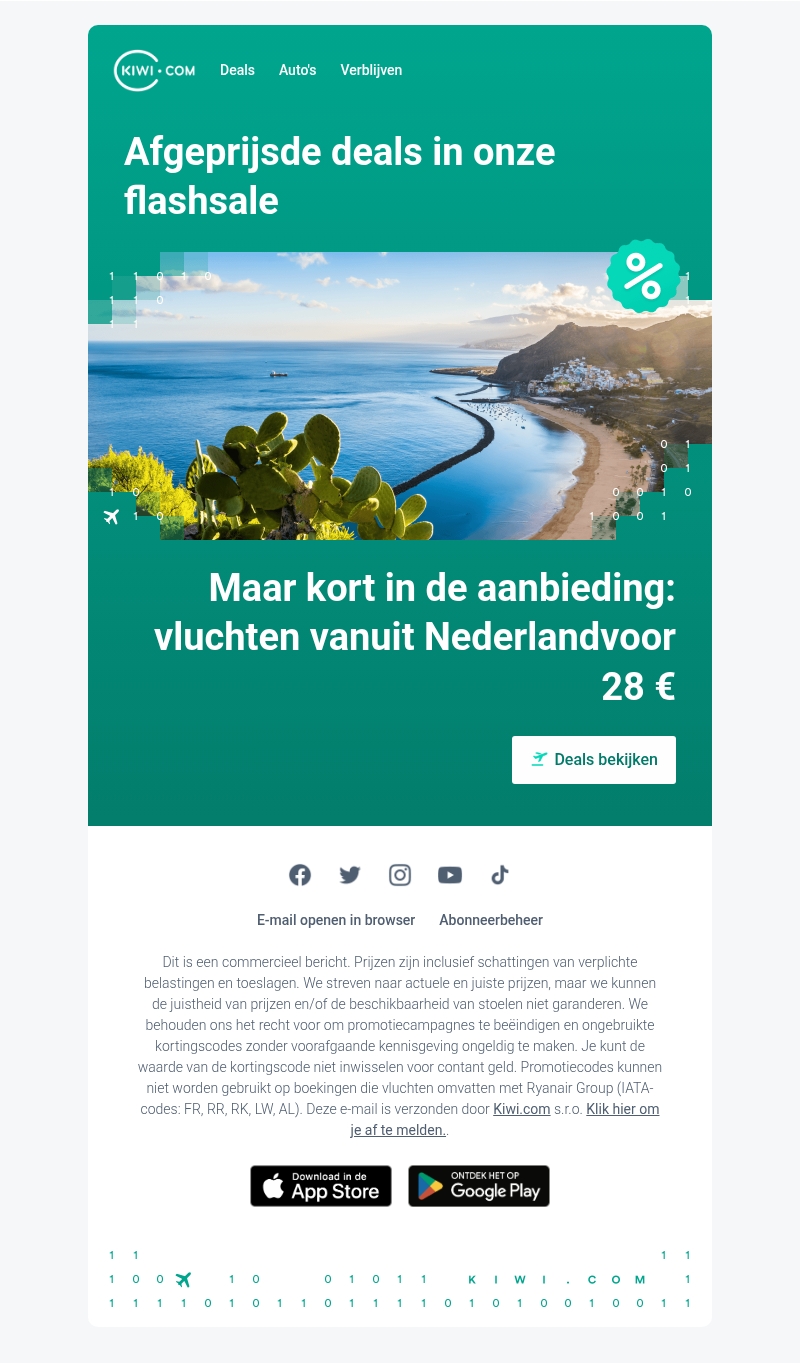 Vrolijke Kiwi-maandag! We bieden je vandaag een korting aan, exclusief voor de Kiwi.com-app