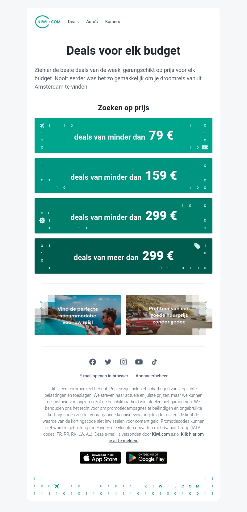 Kiwi.com presenteert de beste reisdeals voor elk budget. Met vluchten, accommodaties en autoverhuur biedt deze nieuwsbrief opties voor iedereen. Ontdek reizen van minder dan 79 €, 159 €, 299 €, en meer. Bezoek droomlocaties zonder je budget te overschrijden. Kiwi.com maakt reizen eenvoudig en betaalbaar.