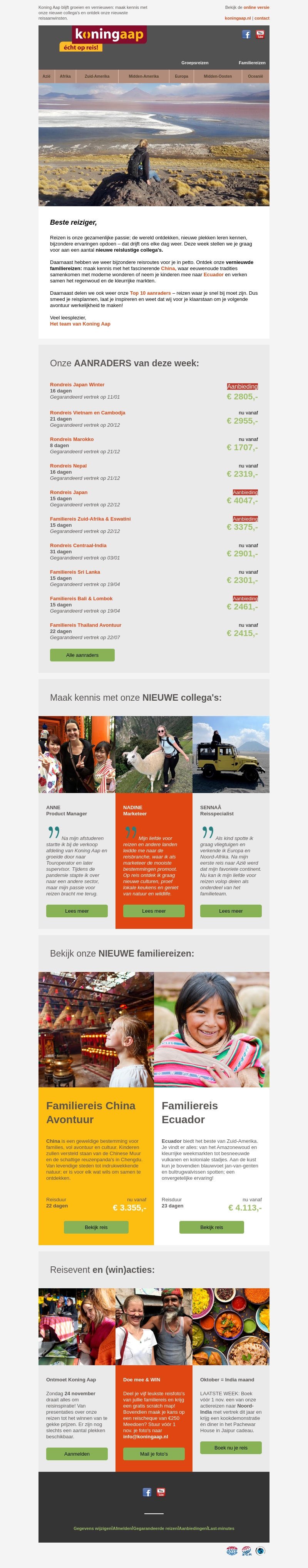 Deze nieuwsbrief van Koning Aap introduceert spannende nieuwe reizen en stelt je voor aan onze nieuwe collega's. Ontdek de prachtige gezinsreizen naar China en Ecuador, speciaal ontworpen om je een onvergetelijke ervaring te bieden. Leer meer over Anne, Nadine en Bennä, onze collega's die je graag verder helpen met al je reiswensen. Neem deel aan onze reiswedstrijd en maak kans op een mooie prijs.