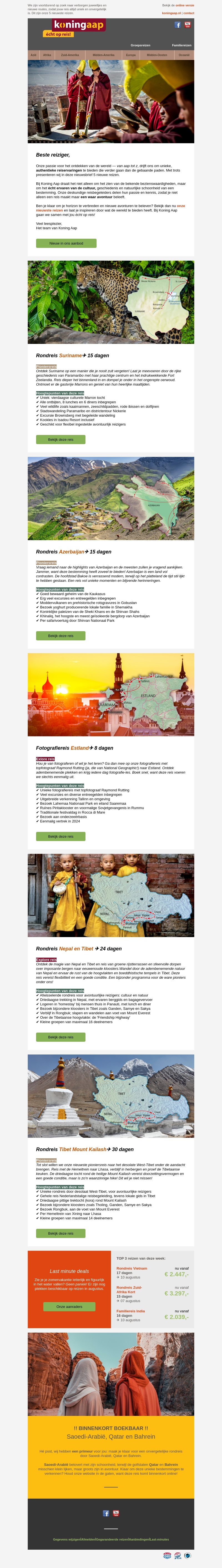 Deze nieuwsbrief introduceert de nieuwste reizen van Koning Aap naar bestemmingen zoals Suriname, Azerbeidzjan, Estland, Nepal, en Tibet. Of je nu houdt van avontuur, cultuur of fotografie, er is voor ieder wat wils. Lees verder voor meer informatie over de reizen en aanbiedingen.